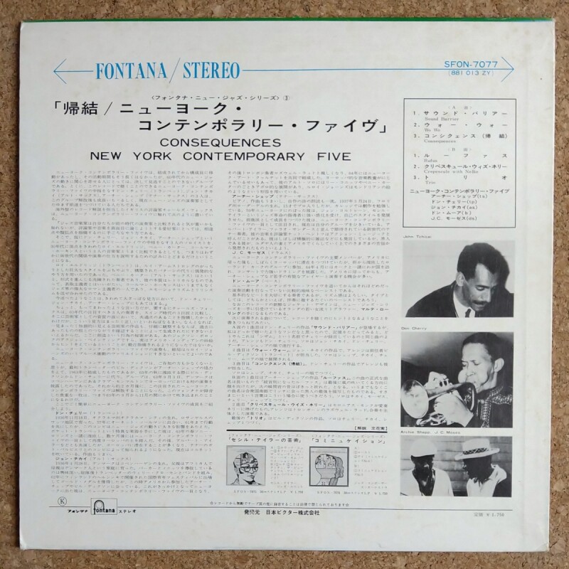 Don Cherry、Archie Shepp、John Tchicaiらを擁したグループ、New York Contemporary Fiveの1963年録音作品。「Sound Barrier」、「Consequences」、「Rufus」、「Trio」などを収録。当時のニュー・ジャズ〜フリー・ジャズの息吹を伝える貴重な作品です。