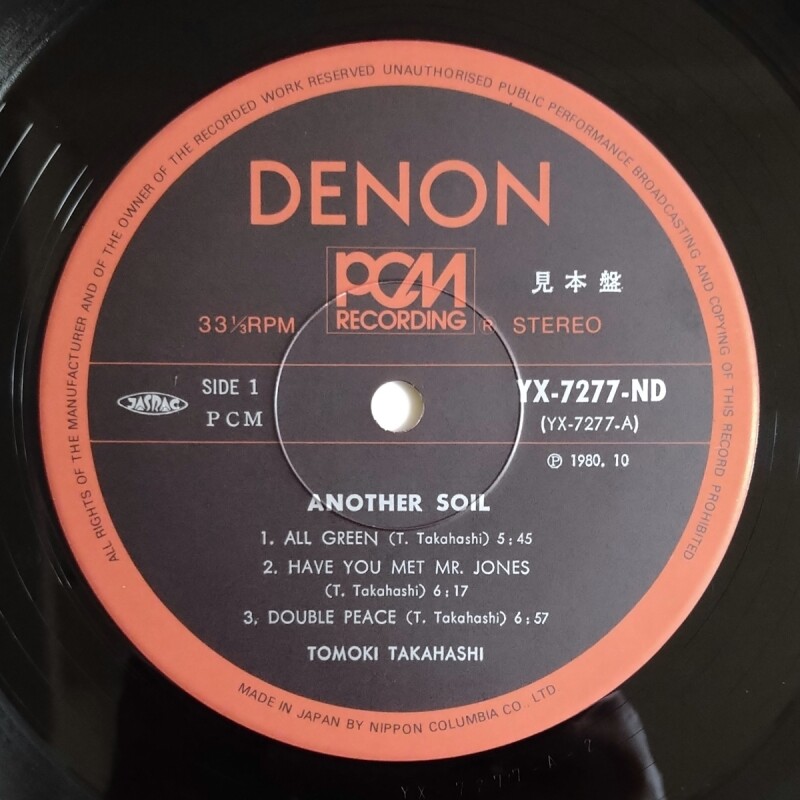 向井滋春や古沢良次郎グループへの参加などで知られるサックス奏者、高橋知己の作品。来日中だったElvin Jonesに加え、向井滋春、杉本喜代志、望月英明らが参加しています。たおやかで美しい「All Green」、躍動感とキレがあってかっこ良い「Have You Met Mr. Jones」、エモーショナルな「Double Peace」、瑞々しい「Another Soil」など、全編素晴らしいです。