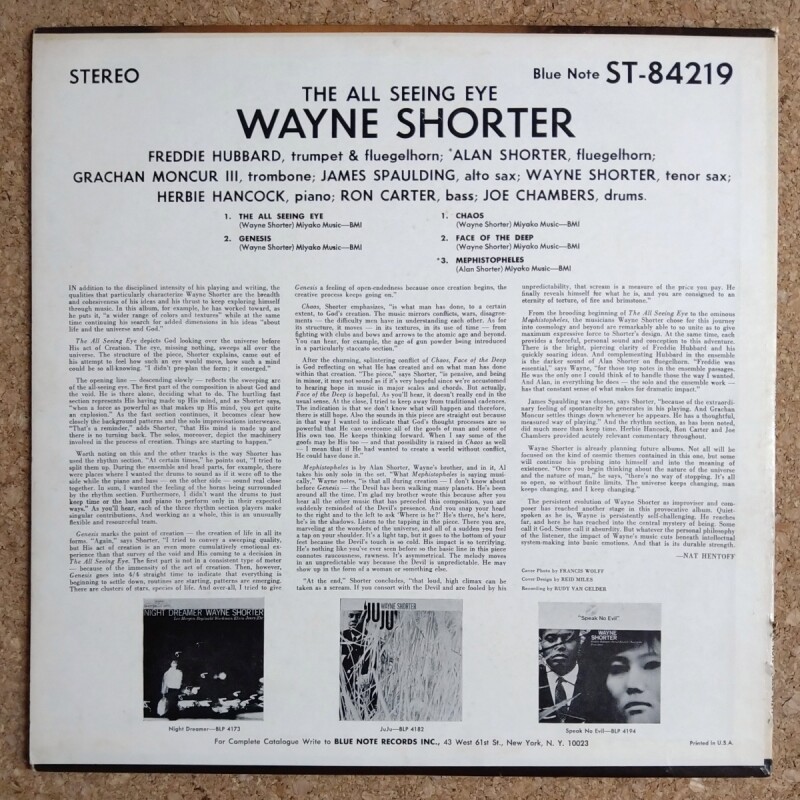 時代を切り拓いてきたサックス奏者、Wayne Shorterの作品。ディープで躍動感に満ちた「All Seeing Eye」、前衛の気配も濃厚な「Genesis」、凄まじい圧力で駆け抜ける「Chaos」、重厚な「Mephistopheles」などを収録。充実の内容です。Freddie Hubbard、Alan Shorter、Grachan Moncur III、Herbie Hancock、Joe CHambersなどが参加。