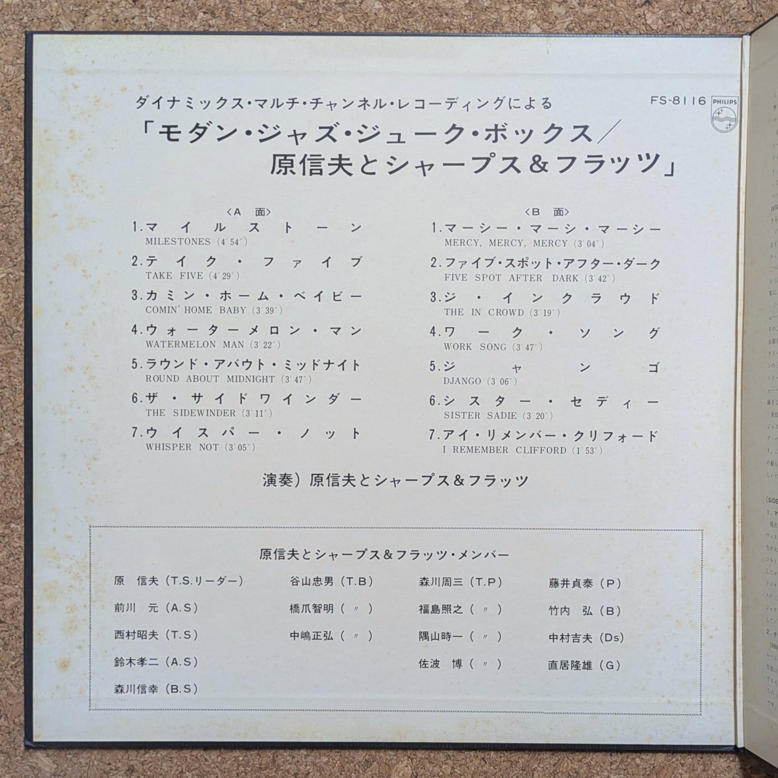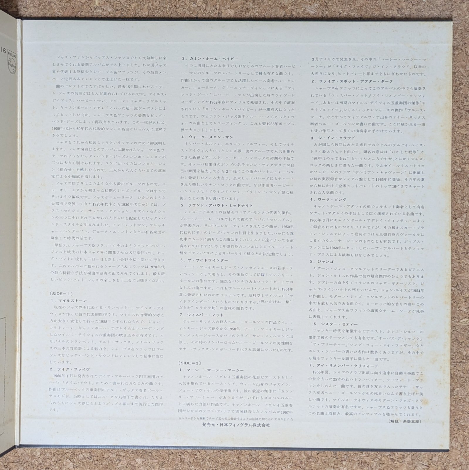 日本を代表するビッグ・バンドのひとつ、原信夫率いるシャープス&フラッツの作品。重厚でありながら疾走感もある「Milestones」、伸びやかな「Take Five」、クールな「Comin' Home Baby」、グルーヴィな「Watermelon Man」、ソウルフルな「Mercy, Mercy, Mercy」など、全編編曲も演奏も素晴らしいです。