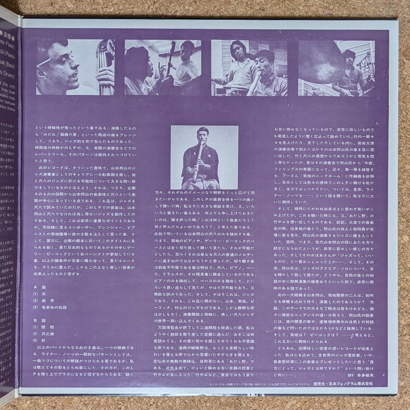 尺八奏者、山本邦山の作品。日本の伝統芸能とジャズが見事に融合した記念碑的作品です。「驟雨(A Heavy Shower)」、「銀界(Silver Ward)」、「終(Epilogue)」など、緊張感溢れる演奏のなか、尺八が深く美しく響きます。菊地雅章、Gary Peacock、村上寛が参加。