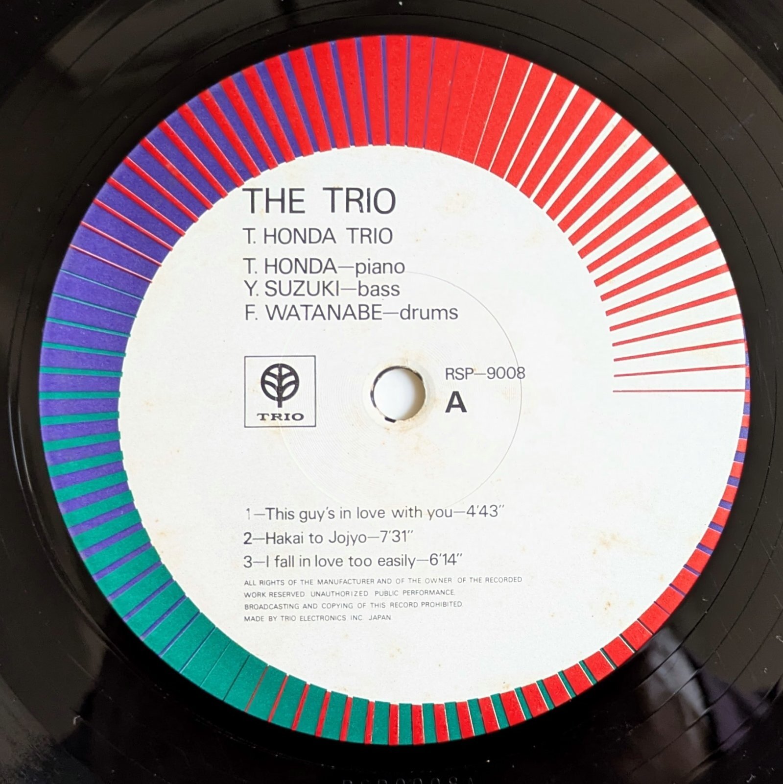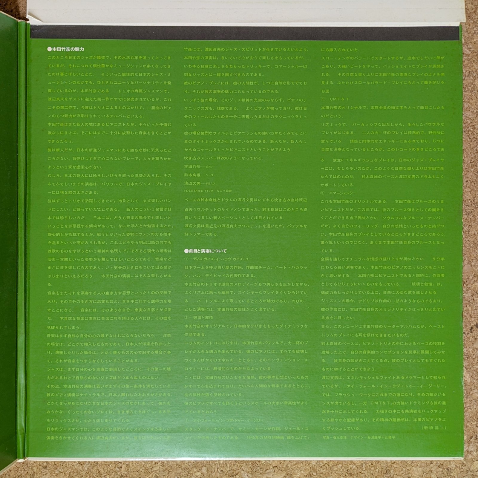 Takehiko Honda - The Trio Takehiko Honda - The Trio 販売価格: 3,850円(税込) 数量: 1 お問い合わせ ディープな楽想と力強いプレイで支持を得た名ピアニスト、本田竹彦の初期作品。情感がほとばしる「破壊と叙情」、クールで重厚な「Emergency」、味わい深い「This Guy's In Love With You」など、全編素晴らしいです。鈴木良雄、渡辺文雄が参加。 cover : VG+若干のスレ、シミ、角に小傷みあり。 record : VG+ to VG++スレが散見しますが音には影響ありません。 ArtistTakehiko HondaTitleThe TrioLabel (Cat#)Trio (RSP-9008)MadeJapan / 1970FormatLPNotes