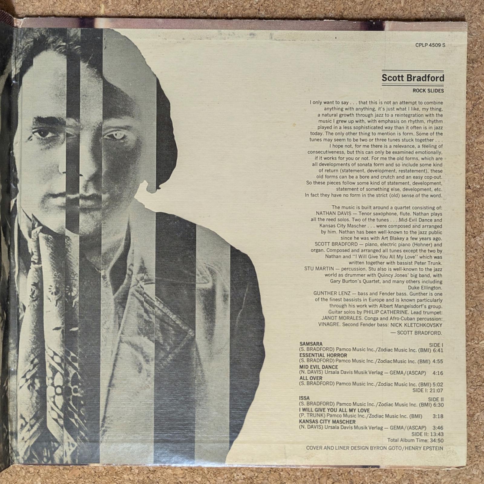 John SurmanやMarc Moulinとの共演で知られる鍵盤奏者、Scott Bradfordのファースト・アルバム。サイケデリックで肌理の粗い、独特の質感のジャズロック〜ジャズファンク作品です。ヒプノティックなピアノのイントロから展開する「Samsara」、ダイナミックでかっこ良い「Mid Evil Dance」、高速で攻める「Issa」、躍動感のある「Kansas City Mascher」などを収録。Nathan Davisの参加も貴重です。