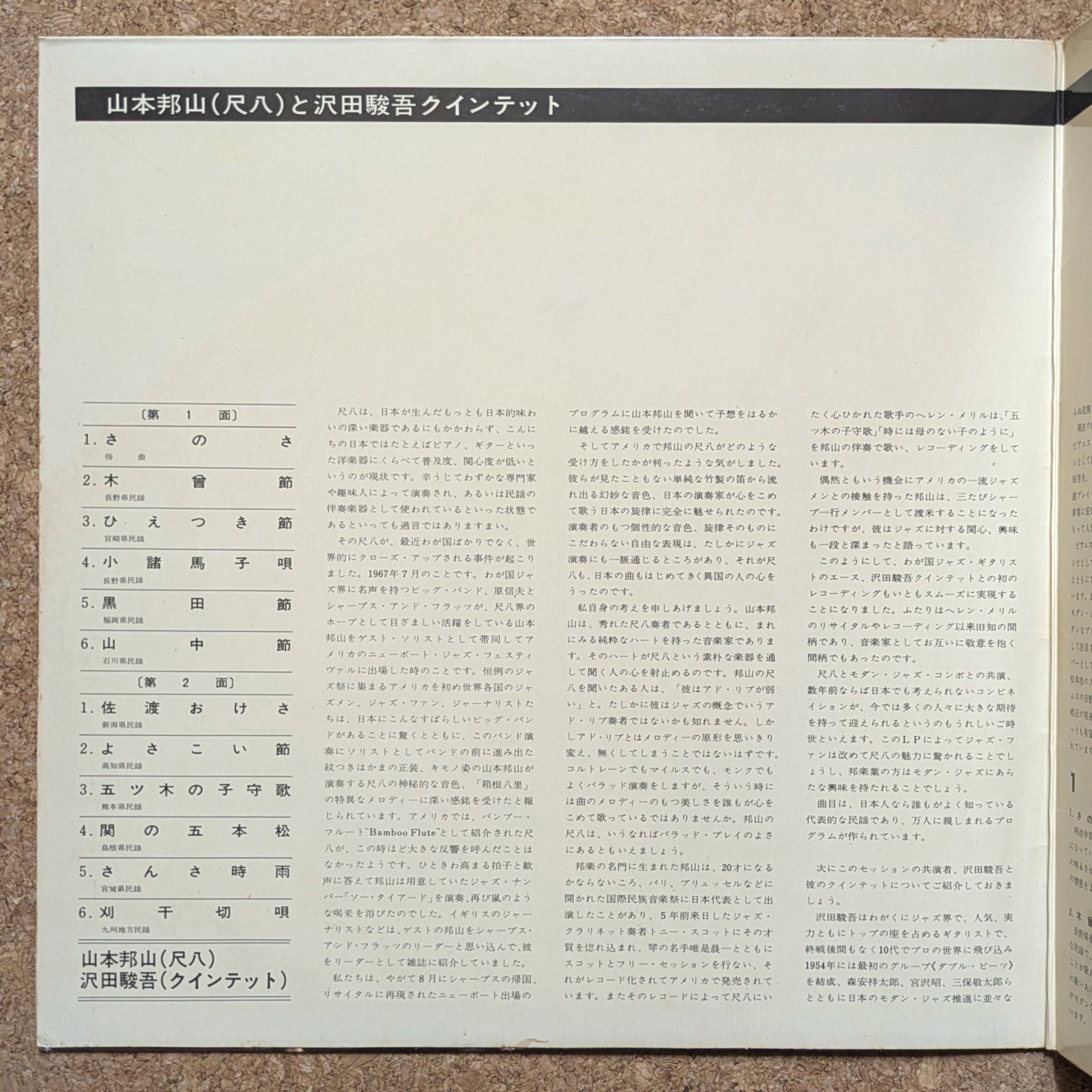 尺八奏者、山本邦山が沢田駿吾クインテットと共演した作品。民謡とジャズをボサ・ノヴァを媒介に融合させた傑作です。「さのさ」、「木曽節」、「ひえつき節」、「黒田節」、「佐渡おけさ」、「関の五本松」など、アレンジも演奏も素晴らしいです。村岡建や日野元彦などが参加。