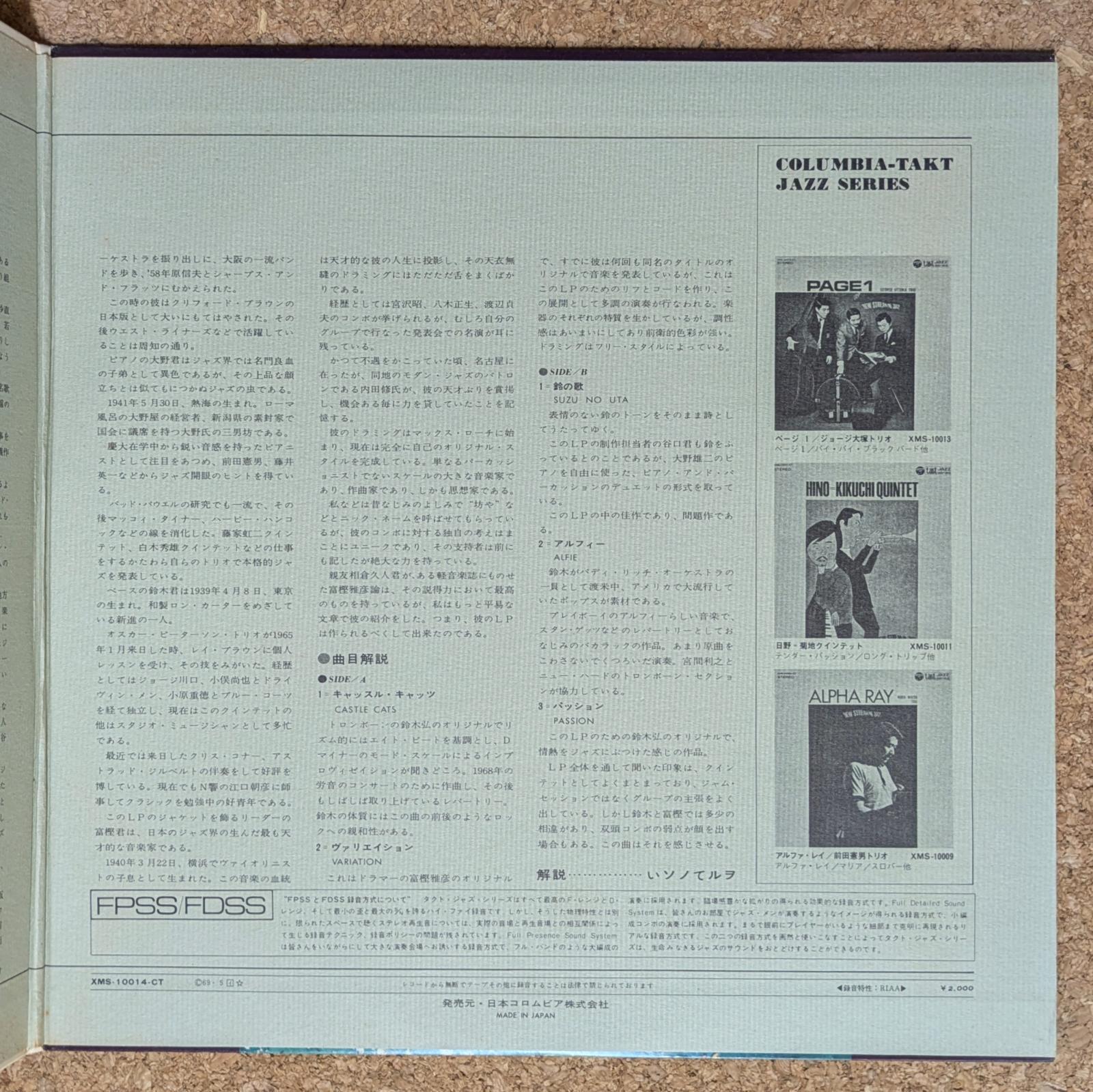 鈴木弘と富樫雅彦の双頭コンボによる唯一のアルバムにして、日本ではじめてニュー・ジャズがレコード化された記念碑的作品です。ジャズロック調からフリージャズへと展開する「Castle Cats」、断続的な鈴の音に大野雄二の美しいピアノが映える「鈴の歌」、アグレッシヴな「Passion」などを収録。素晴らしい作品です。