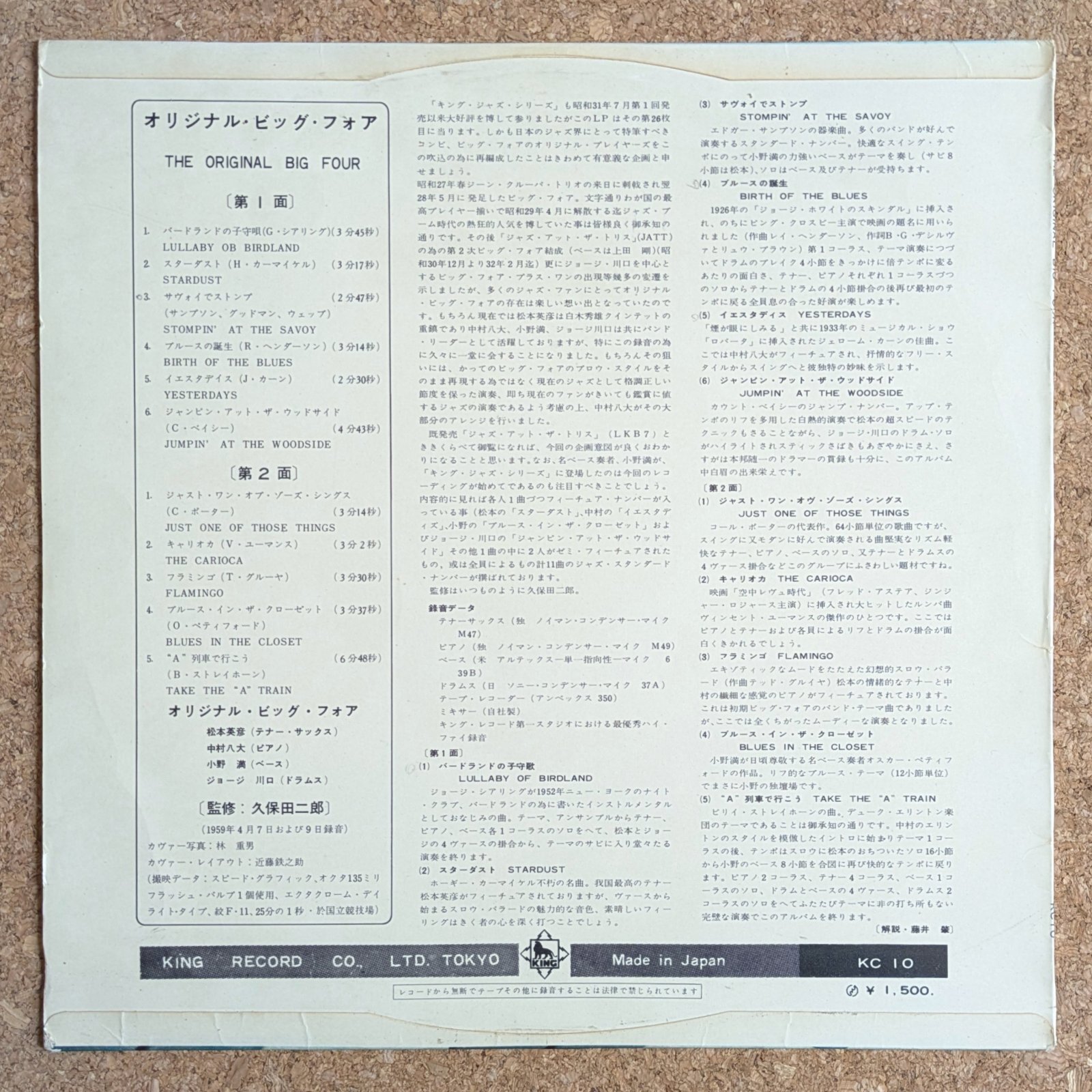 時代を彩った名コンボ、ジョージ川口率いるビッグ・フォアの作品。味わい深い「Lullaby Of Birdland」、クールな「Stompin' At The Savoy」、川口のドラムソロも強烈な「Jumpin' At The Woodside」、軽快で心地良い「Just One Of Those Things」、大らかにスウィングする「Take The "A" Train」などを収録。日本のモダンジャズ黎明期の貴重な記録です。松本英彦、中村八大、小野満が参加。