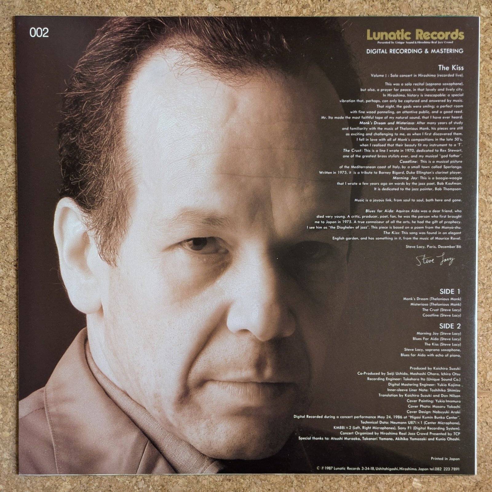 独自の音楽性と存在感でシーンに大きな影響を与えたサックス奏者、Steve Lacyの作品。広島におけるソロ・コンサートの実況録音です。「Monk's Dream」、「The Crust」、「Coastline」、「Blues For Aida」など、モンク作の2曲と自身のオリジナル5曲を収録。素晴らしい演奏です。