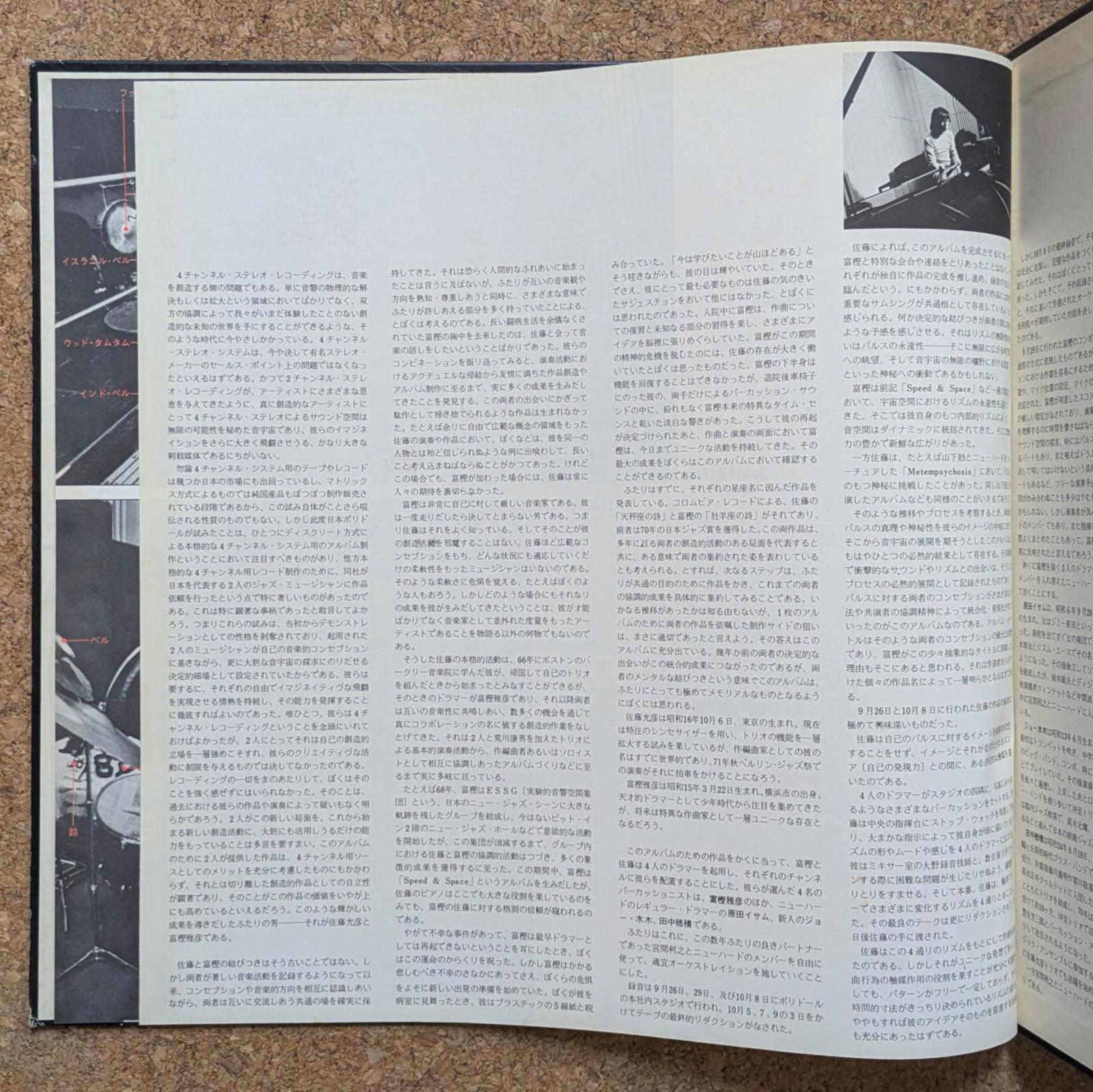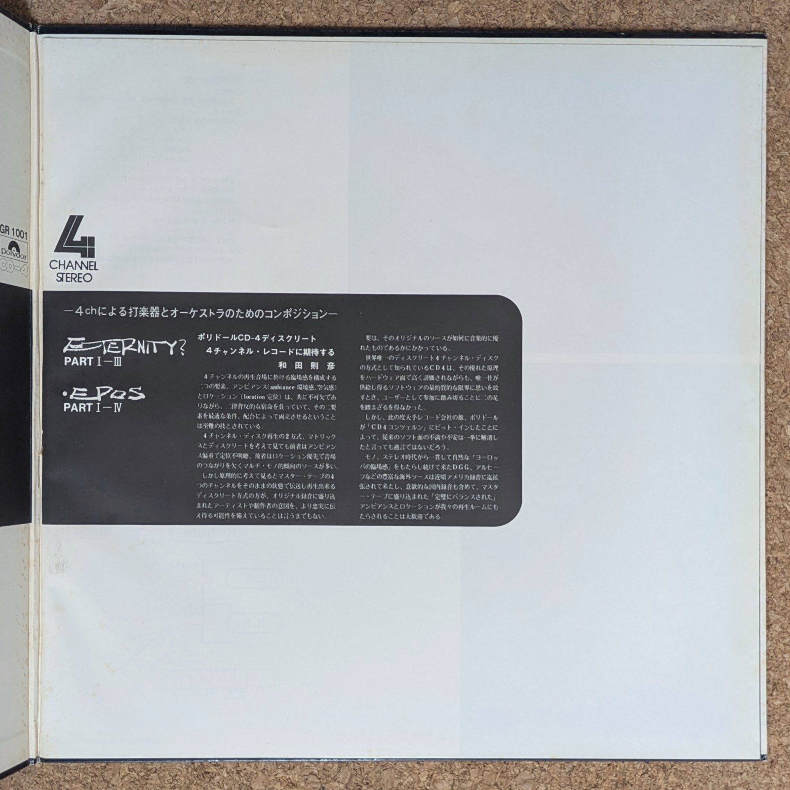 宮間利之率いるニューハードと4人のドラマーが共演した作品。富樫雅彦作/編曲による3パートからなる「Eternity?」(サウンドファイルは「Part 2」)と、佐藤允彦作/編曲による4パートからなる「Epos」を収録。副題に<4chによる打楽器とオーケストラのためのコンポジション>と銘打った意欲作です。原田イサム、ジョー水木、田中穂積などが参加。
