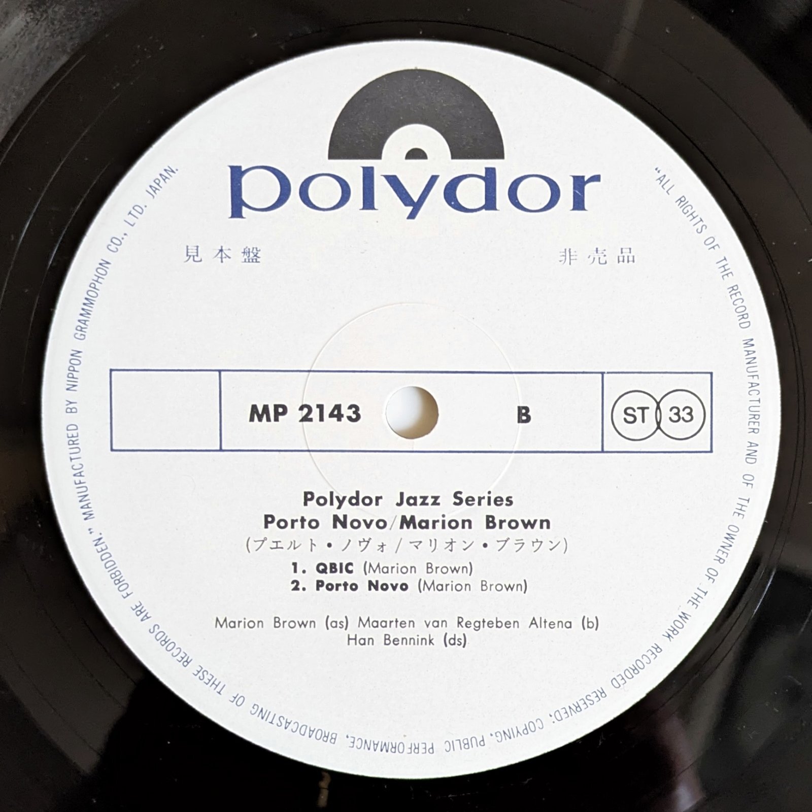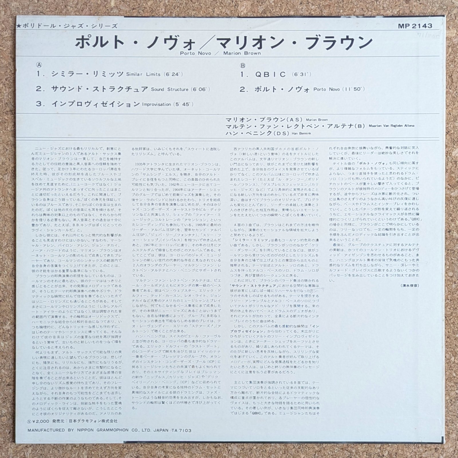 フリー〜アヴァンギャルド・ジャズのシーンを牽引したミュージシャンのひとり、サックス奏者Marion Brownの作品。Maarten Van Regteren Altena、Han Benninkが参加。「Similar Limits」、「Qbic」、「Porto Novo」など、圧の高い激しい演奏のなかBrown独特の味わいも滲む素晴らしい演奏です。