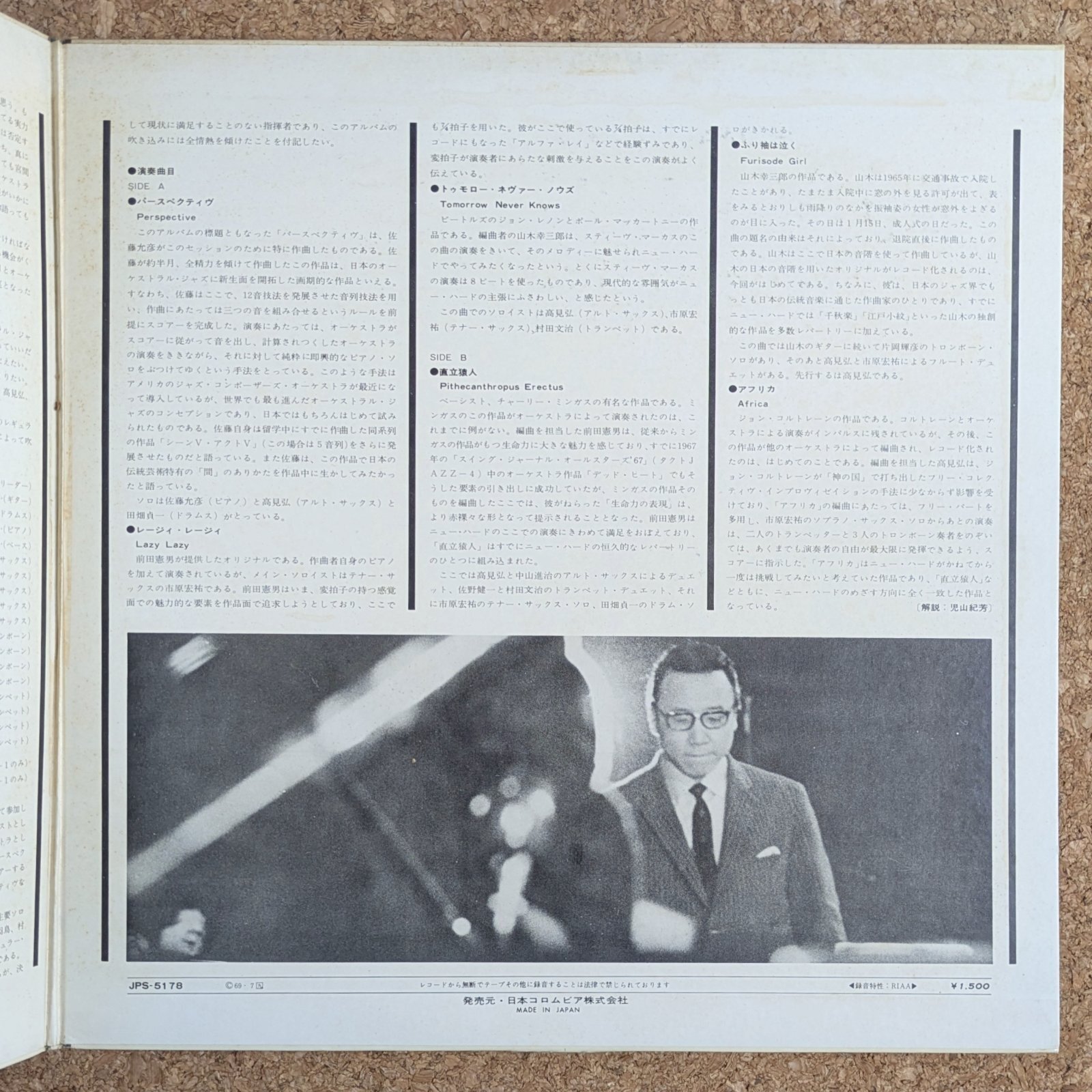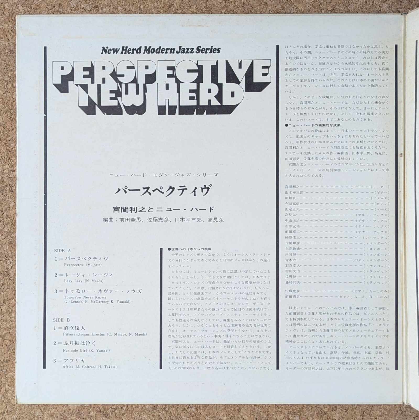 宮間利之率いるニュー・ハードの作品。ビッグ・バンド・ジャズの新たな地平を切り拓いた記念碑的作品です。佐藤允彦作/編曲のアヴァンギャルドな「Perspective」、前田憲男作/編曲のソウルフルでかっこ良い「Lazy Lazy」、同グループのレパートリーでもあるミンガス作「Pithecanthropus Erectus」、和テイストの「ふり袖は泣く」、コルトレーン作のアフロ・モーダル「Africa」など、全編素晴らしいです。