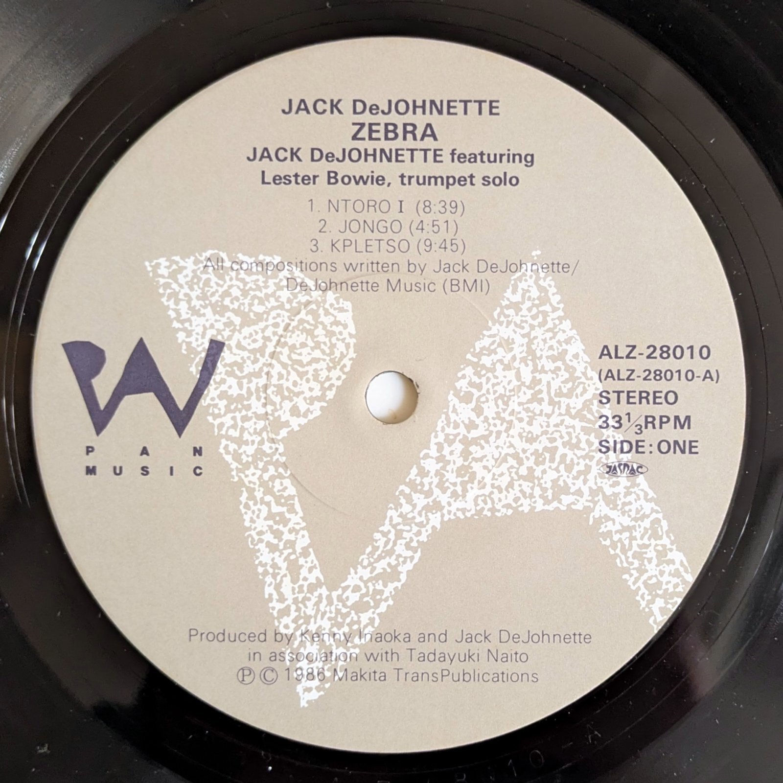 シカゴ出身の名ドラマー、Jack DeJohnetteが写真家、内藤忠行の映像作品『Zebra』のために録音した作品。DeJohnetteのドラムマシーン〜シンセサイザーにLester Bowieのトランペットが絡む異色作にして傑作です。「Ntro I」、「Jongo」、「Aho」など、全編エキゾチックでヒプノティックでディープです。