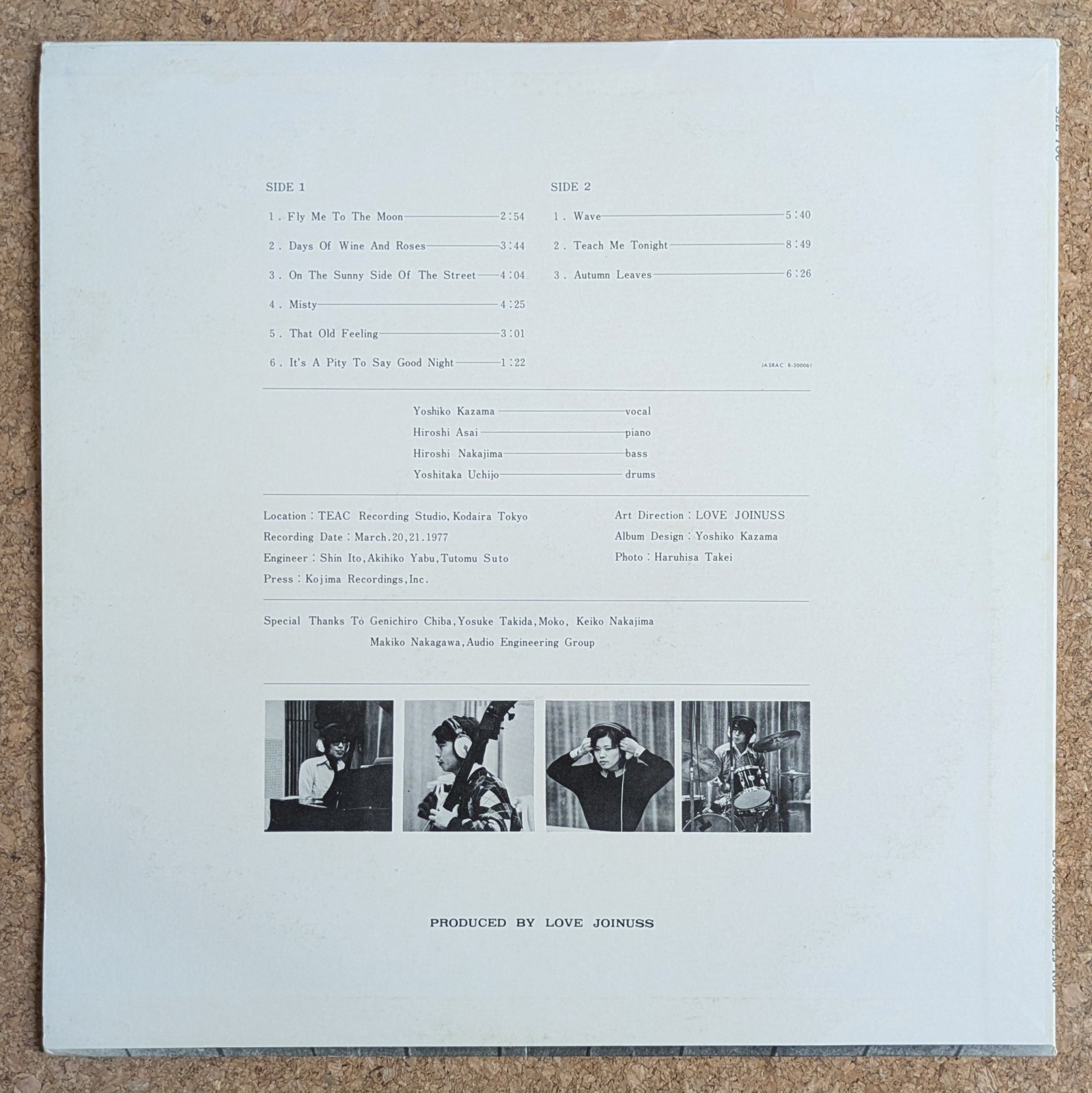 東京を拠点にしたと思われるグループ、Love Joinussがセルフ・プロデュースでリリースした作品。女性ヴォーカルをフィーチャーした「Fly Me To The Moon」や「Days Of Wine & Roses」、またピアノ・トリオによる「Wave」や「Autumn Leaves」など、スタンダードを中心にじっくり聴かせます。